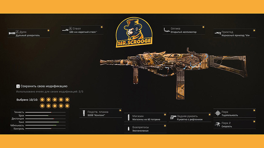 Пистолет-Пулемет ARMAGUERRA 43 Август, 2022, 5 сезон Дуло: Дульный ускоритель Ствол: 180-мм короткий ствол "Имерито" Оптика: Открытый коллиматор Приклад: Каркасный приклад "Имерито" Подств. Планка: SG98 "компакт" Магазин: Магазин на 60 патронов Боеприпасы: Экспансивные Задняя рукоять: Рукоять с рифлением Перк 1: Тщательность Перк 2: Скорость